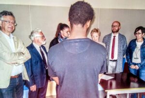 Au cours de cette mission interministérielle dans les prisons françaises, M.SOIGNEUX prenait plaisir à remettre aux personnes détenues (majeurs et mineurs) des diplômes et des prix, comme ci-dessous lorsqu’il remet un prix à un mineur – lauréat d’un concours d’écriture organisé par l’AMOPA.